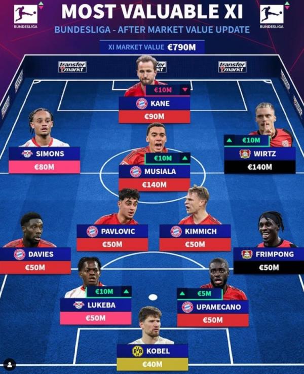 12月20日訊 《轉會市場》今日更新了德甲球員身價,并列出了一套德甲最貴陣,拜仁6將在列,萊比錫、藥廠各2人。